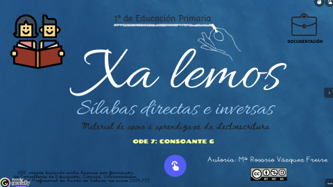 7º ODE de un material, “XA LEMOS”, compuesto por un total de 10 diseñadas para consolidar la lectoescritura de sílabas directas e inversas con todas las letras del alfabeto de nuestra lengua. Este material, que consta de 7 tipos diferentes de actividades interactivas y autoevaluables, es la 2ª parte de un proyecto que se inició con el material interactivo “A ler” que también forma parte de este repositorio.
