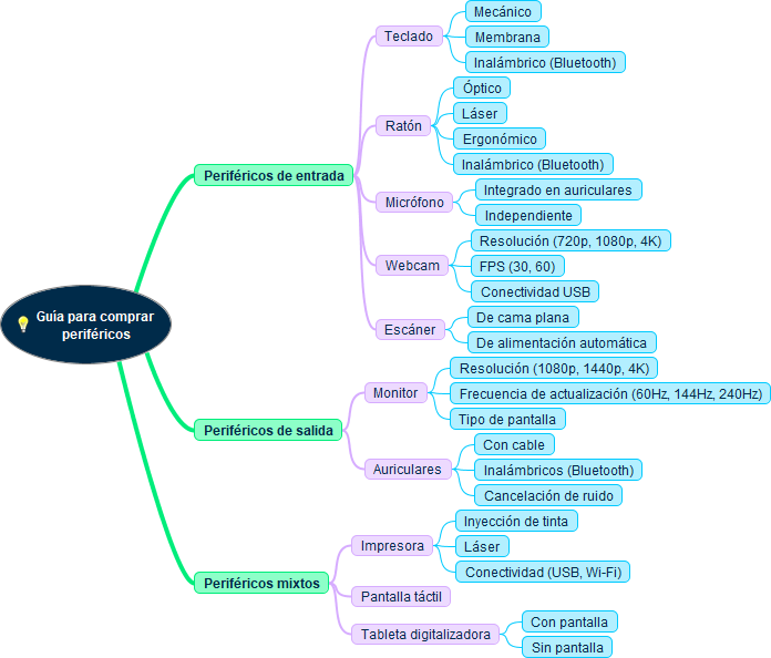 | Esquema "Guía para comprar periféricos" - sección 3.1 Hardware periférico | Esquema "Guía para comprar periféricos" editable MM (Freemind) PNG |