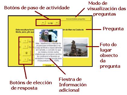 Sinalar que nas dez preguntas de cada pantalla haberá lugares das catro provincias galegas e non existe unha progresión en canto á dificultade dentro das seis (no nivel Básico) ou dez (nivel Avanzado) series de cada nivel.