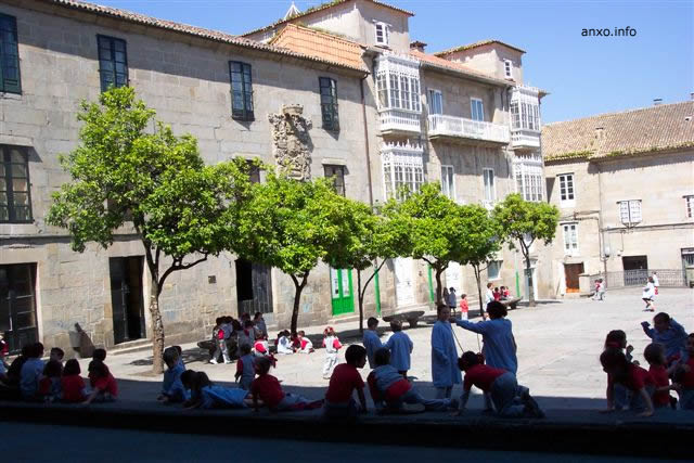 Na pontevedresa Praza do Teucro cando as laranxeiras están en flor cos pequenos xogando arredor: