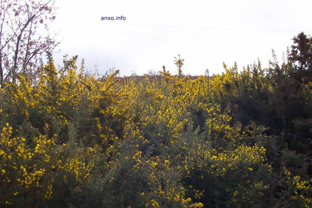 Típico monte galego cuberto de toxo en flor en Santa Comba de Bande