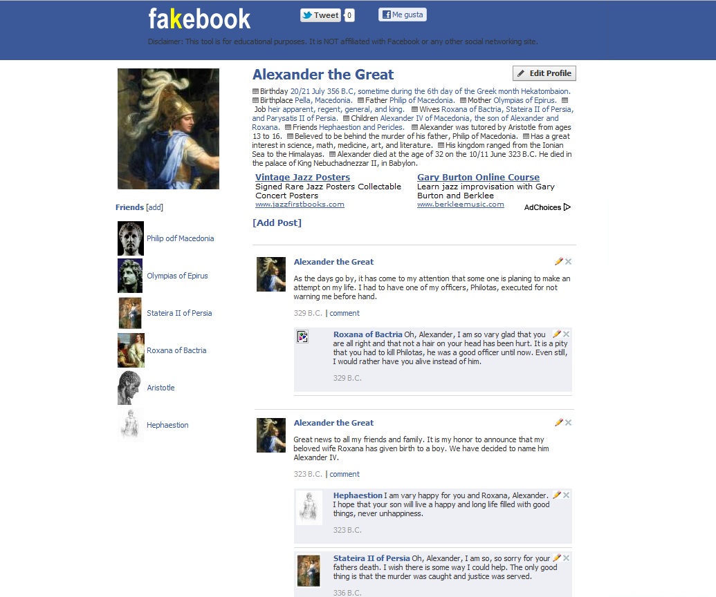 Have you heard of "Fakebook"? Fakebook by Classtools.net allows teachers and students to create an imaginary profile of a person in the style of Facebook. Start by typing the name of the person at the top. Fakebook will automatically pull in an image from the web for famous or historic people. Then just add friends, posts, videos and comments to tell more about the person or events. View the Fakebook of Alexander the Great for an example of how to use this resource.