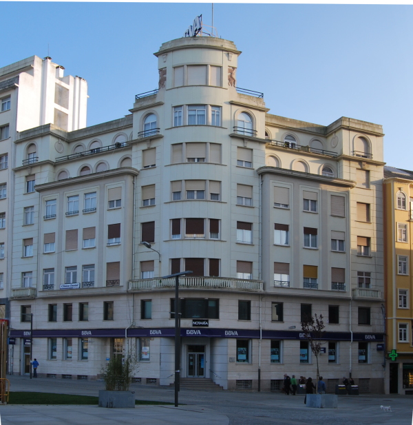 Atopa os puntos de fuga e a liña de horizonte na seguinte imaxe e redebuxa os trazados fundamentais da perspectiva deste edificio.