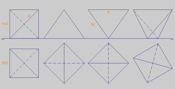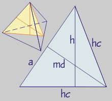 a = arista. hc = altura de cara. h = altura do poliedro. md = mínima distancia entre aristas opostas.