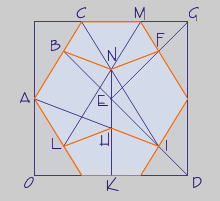 En la primera proyección aparecen en verdadera magnitud las medidas a, d, dc. En la segunda, la altura es la distancia entre vértices opuestos (dv). Se divide en tres tramos iguales, y la sección áurea de los tercios da las alturas restantes: