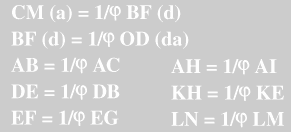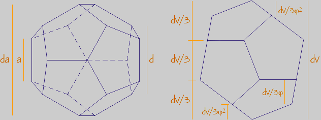 La primera proyección es similar a una sección principal. En la segunda, las alturas a utilizar son la arista (a), la diagonal de cara (d) y la distancia entre aristas opuestas (dc). Cada una es sección áurea de la siguiente: