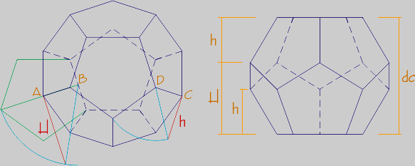 Construción: Se parte de un pentágono regular como base. Se traza la circunferencia circunscrita y la base superior. Se adosan a la base otros dos pentágonos como caras abatidas. Desde los dos vértices que se juntan en el poliedro se trazan perpendiculares a las charnelas, cruzándose en el punto P, por el que se traza otra circunferencia concéntrica: