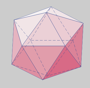 16 ejes. 6 pasan por dos vértices y 10 por los centros de dos caras* Poliedro dual