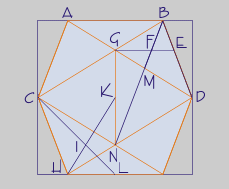 Para calcular las alturas, se trazan perpendiculares en los extremos del diámetro CB, mediatriz del lado en el que hemos adosado el pentágono, y desde el punto medio de este lado (A), las alturas del triángulo y del pentágono dan las de la segunda proyección, H y h. h es sección áurea de H, y H sección áurea de la altura total dc (distancia entre caras opuestas):