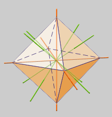 7 eixos. 3 pasan por dous vértices e 4 polos centros de dúas caras* Poliedro dual
