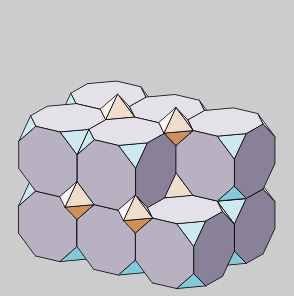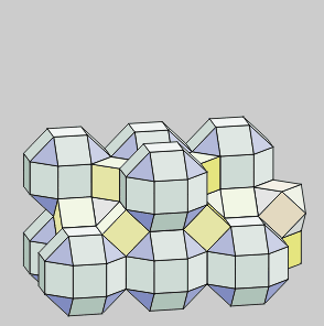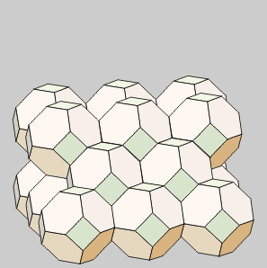 Los Teselados o empaquetamientos son combinaciones de poliedros capaces de cubrir completamente el espacio tridimensional. Las condiciones que deben cumplir los poliedros para formar agregados son: tener las aristas de la misma medida, tener algún tipo de cara igual y tener ángulos diedros susceptibles de combinarse para sumar 360º. Del mismo modo que con pentágonos no se puede teselar el espacio plano, el Dodecaedro, el Icosaedro y sus derivados no participan en los empaquetamientos. En la práctica, los poliedros combinables son el Tetraedro, Hexaedro, Octaedro y otros no regulares derivados de ellos. |