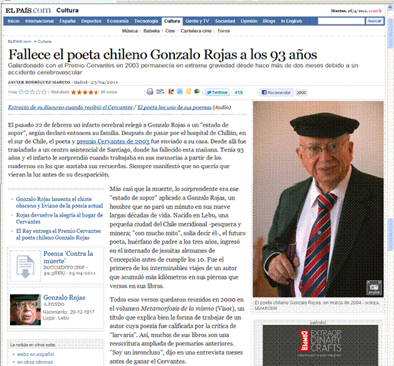 En la parte central de la columna derecha los tres titulares que vienen en letra azul y los dos recuadros que contienen un documento en PDF, poema “Contra la muerte”, y la sección A FONDO, con el artículo “Gonzalo Rojas.