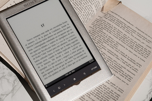 Visualización de un libro electrónico (e-book) junto a un libro tradicional colocados ambos bajo sol directo