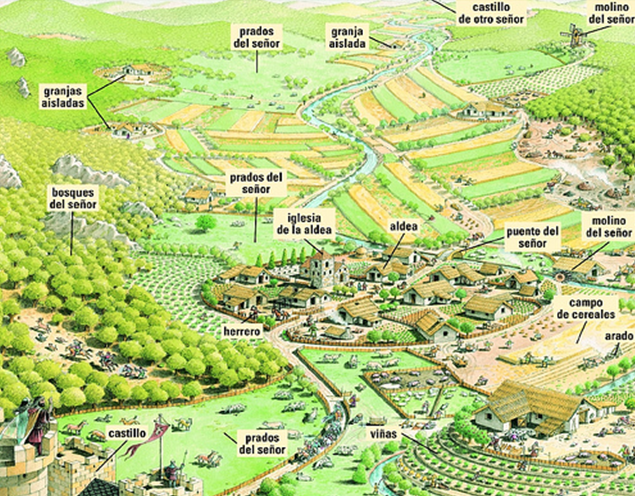 A economía feudal: na busca da autosuficiencia. Era unha economía totalmente baseada na agricultura e na gandaría. As terras eran traballadas polos servos do señor feudal e por algúns campesiños libres. Estes últimos tiñan que pagar unhas rendas moi elevadas ao señor, e a décima parte da colleita (o décimo) á Igrexa. Era unha economía de autoabastecemento, polo que o comercio case non existía.