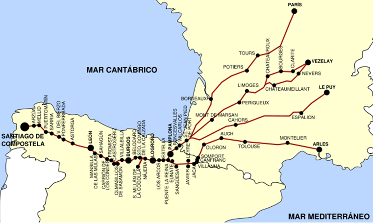 Entre os camiños que seguían estes visitantes, o que tivo máis tráfico foi o que atravesaba os Pireneos por Roncesvalles ata Pamplona; desde aquí partían outras rutas distintas, aínda que a que tivo máis importancia foi o chamado actualmente Camiño Francés. Ao longo do Camiño edificáronse moitas igrexas, hospitais e hospedarías en pobos e cidades: Xaca, Pamplona, Lizarra, Logroño, Santo Domingo de la Calzada, Burgos, León, Santiago, etc.