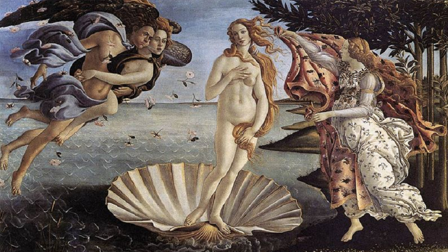 S8. O Renacemento supuxo a volta aos modelos arquitectónicos, escultóricos e pictóricos clásicos. Despois de varios séculos, nos que a relixión cristiá impuxera os seus modelos, renacen os mitos clásicos. Observe e analice esta famosa pintura, O nacemento de Venus, de Sandro Botticelli. Galería dos Uffizi, Florencia (1485). Lea despois o texto e complete o cadro.