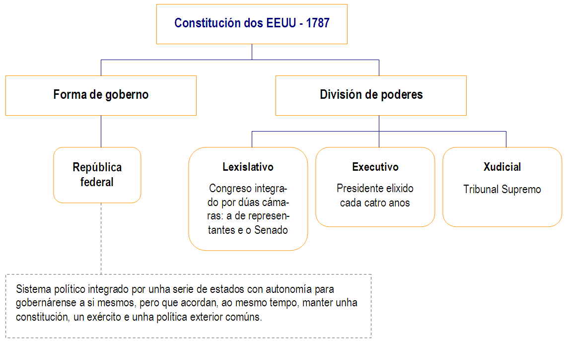 S23. Seguindo este esquema, explique as características fundamentais da constitución dos Estados Unidos de América e do seu sistema político.