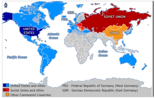 Durante máis de corenta anos, as relacións entre as dúas superpotencias caracterizáronse por un estado de tensión permanente, de acoso continuado do contrario, de ameazas de guerra tanto convencional coma atómica, de confrontación ideolóxica, de guerra económica e de espionaxe. Esta tensión e ameaza constantes coñécese co nome de Guerra fría, que perdurou ata a caída do réxime comunista na URSS en 1991.