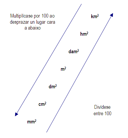 A unidade de superficie no sistema internacional é o metro cadrado (m2). O valor dos múltiplos e dos submúltiplos da superficie vai de cen en cen.