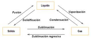No gráfico seguinte indícanse os posibles cambios de estado da auga. Para pasar de estado sólido a líquido ou a gasoso cómpre aumentar a temperatura, entanto que para pasar de estado gasoso a líquido ou sólido cómpre que a temperatura diminúa.