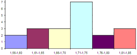 - Histograma. Cando a variable ten valores continuos é mellor representar os datos nun histograma. Úsanse tamén rectángulos pero que, neste caso, teñen superficie proporcional á frecuencia. Se as clases teñen a mesma medida pódense usar as frecuencias como alturas. Así, para representar as alturas dos alumnos, pódese utilizar un histograma.