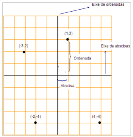 Precisamos unicamente dous eixes, un vertical e outro horizontal que se cruzan nun punto que consideramos orixe de coordenadas. Cada punto ten dúas coordenadas. A primeira mide a distancia do punto ao eixe de ordenadas e chámase abscisa. A segunda mide a distancia do punto ao eixe de abscisas e chámase ordenada. Cando as coordenadas se miden cara á esquerda e abaixo considéranse negativas.