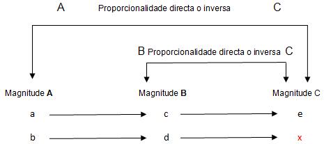 Multiplícanse as razóns das cantidades da mesma magnitude, pondo a razón inversa se a proporcionalidade é inversa,e iguálanse coa razón das cantidades da incógnita.