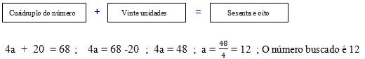 Exemplo: atopar un número tal que o cuádruplo do devandito número mais vinte unidades sexa igual a sesenta e oito.