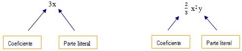 Un monomio é o produto indicado dun valor coñecido, representado por un número (coeficiente) por un ou varios valores descoñecidos, representado por letras (parte literal). A parte literal pode ter expoñentes naturais.