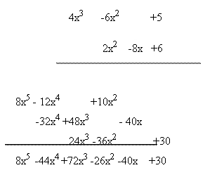 – Para multiplicar polinomios comézase pola esquerda e multiplícase o primeiro monomio do segundo polinomio por todos os monomios do primeiro polinomio; os coeficientes multiplícanse e os expoñentes súmanse. Se falta o termo dalgún grao déixase un oco.