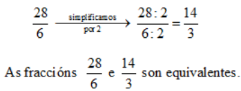 Do mesmo xeito, podemos simplificar unha fracción dividindo o numerador e o denominador polo mesmo número, obténdose outra fracción equivalente á primeira: