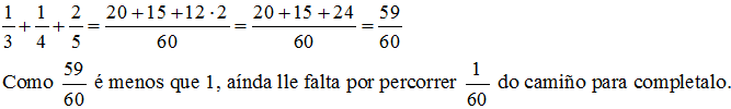 S3. Cando Xelmiro volveu de facer o Camiño de Santiago contounos, do que lle quedaba por andar os tres últimos días, o seguinte: “o primeiro día andei 1/3 do camiño, o segundo 1/4 e o terceiro 2/5, e cheguei á praza do Obradoiro”. Eu parei a pensar e díxenlle: “Mentireiro!. Non chegaches!” Como o souben?