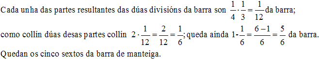 S7. Dunha barra de manteiga separei a cuarta parte. Esta última dividina en tres partes iguais e collín dúas. Que fracción da barra de manteiga collín? Que fracción da barra me queda aínda?