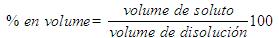Adoita empregarse esta forma de expresar a concentración cando os dous compoñentes son líquidos ou gases. Calcúlase dividindo o volume de soluto entre o volume da disolución, multiplicando por cen: