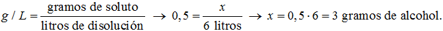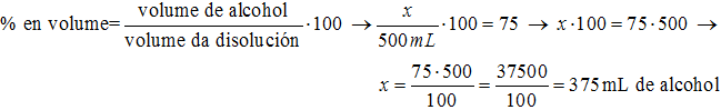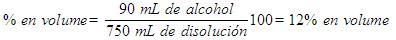 Exemplo: dunha botella de viño albariño de 750 mL, 90 mL son de etanol (alcohol). Cal é a porcentaxe en volume da disolución?