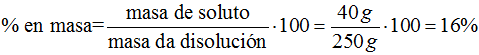 Disolvemos 40 g de sal en auga, resultando 250 g de disolución. Cal é a porcentaxe en masa da disolución resultante?