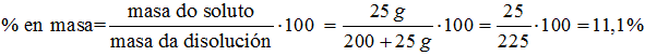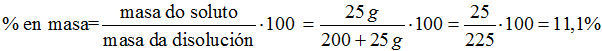 Preparamos unha disolución disolvendo 25 g de ioduro potásico en 200 g de auga. Cal é a porcentaxe en masa da disolución resultante?