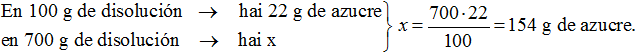 S21. Unha disolución de azucre en auga é do 22 % en masa. Canto azucre hai en 700 gramos de disolución?