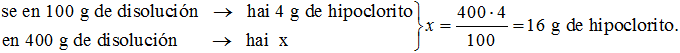 S23. A lixivia é unha disolución de hipoclorito sódico, NaClO, en auga, cunha concentración aproximada do 4 % en masa. Cantos gramos de hipoclorito haberá en 400 gramos de lixivia?