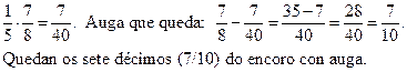 S25. A auga que hai nun encoro é as 3/4 partes da súa capacidade total. Coas chuvias do mes pasado a cantidade de auga aumentou en 1/2 do que faltaba para encher o encoro. Que fracción de auga hai no encoro agora? O mes no que andamos non choveu nada, e consumimos 1/5 da auga que contiña. Que fracción da capacidade total do encoro queda con auga?