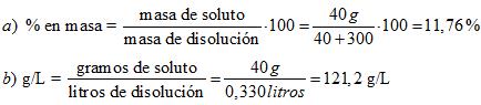 S49. Preparamos unha disolución disolvendo 40 g de cloruro potásico, KCl, en 300 gramos de auga, resultando 330 mL (mililitros) de disolución. Calcule: