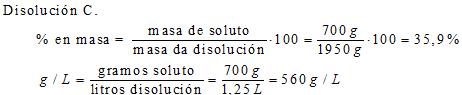 S52. Ache a concentración das disolucións A, B e C cos datos contidos na táboa seguinte en g/L e en porcentaxe en masa: