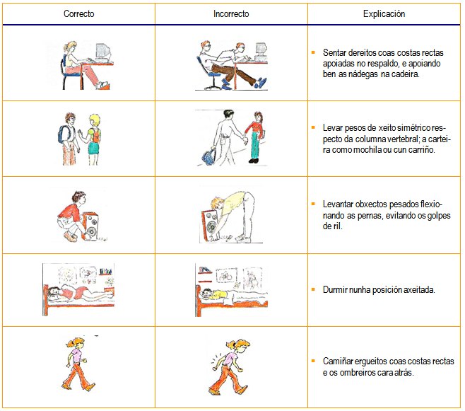 Os músculos teñen que loitar contra o peso do propio corpo; o exercicio físico fortalece a musculatura e axuda a manter o equilibrio. Vexamos graficamente algunhas posturas correctas e incorrectas.
