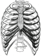 Caixa torácica. Formada polas vértebras dorsais, o esterno e as costelas. Protexe órganos vitais, como o corazón e os pulmóns.