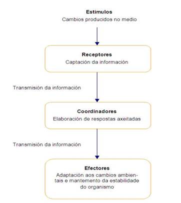 A función de relación realízase en varias etapas: recepción dos estímulos (órganos receptores), integración da información e elaboración dunha resposta axeitada (órganos coordinadores), e resposta ante o estímulo (órganos efectores).