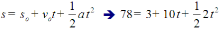 Un móbil parte da posición inicial so = 3 m cunha velocidade de 10 m/s e aceleración 2 m/s2. Canto tempo tardará en pasar pola posición s = 78 m?