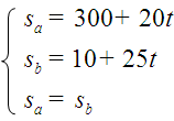 Aplicamos a ecuación da posición do movemento uniforme (s = so + v.t) aos dous móbiles: sa = 300 + 20.t; sb = 10 + 25.t