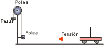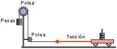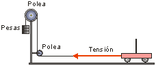 Vexamos cualitativamente a relación entre forza, masa e aceleración, coa montaxe da figura. Un carriño é arrastrado por unha corda que ten unhas pesas penduradas no outro extremo. Estas pesas tensan a corda e esta tensión tira do carriño cara a adiante.