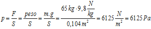 Calcule a presión que exerce unha persoa de 65 kg que está de pé sobre o chan; a sola de cada un dos seus zapatos ten unha área de 520 cm2.