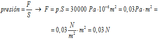 Cun martelo exercemos unha presión de 30 000 Pa sobre un cravo que ten unha superficie de apoio sobre a madeira de 1 mm2. Canta forza fai o cravo contra a madeira?